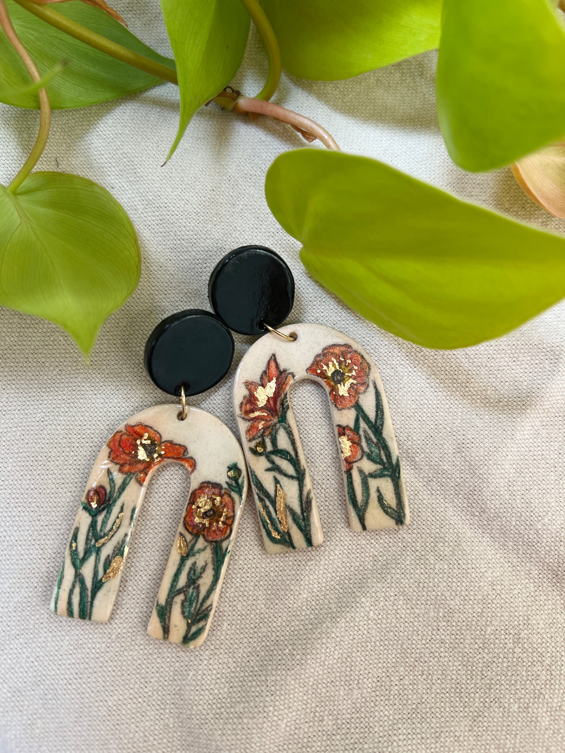 Handmade paperclay earrings. These earrings are handmade from start to finish, they are drawn on with colored pencil, painted on with acrylics, and coated with a high gloss acrylic varnish. This pair is one of a kind and no other pair is like it.